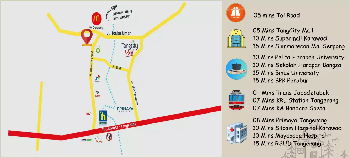Victoria Village berlokasi strategis di daerah Karawaci, Kota Tangerang. Hanya 5 menit ke Tol Jakarta-Tangerang & Tang City Mall.